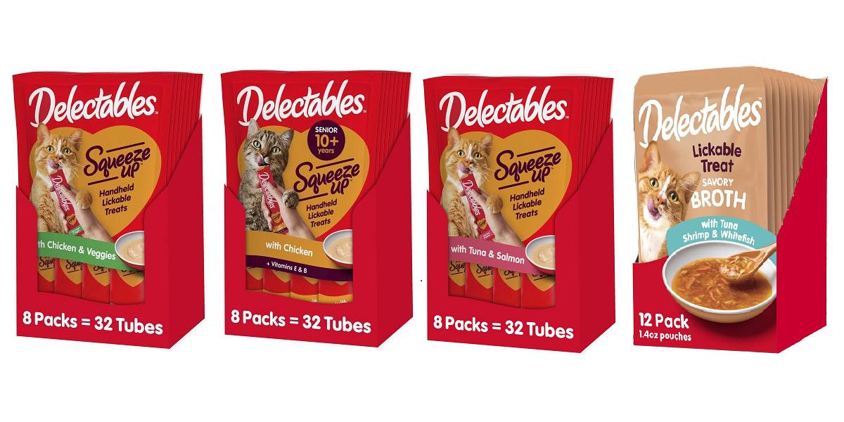 Per Hartz, their Delectables treats were the first gourmet wet cat treat. The treats are available as lickable treats, squeeze-ups, broths, stews, bisques, and in other textures. They also make kitten, adult, and senior formulas.