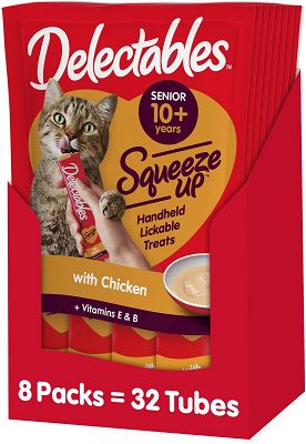 | Delectables™ Squeeze Up™ – Senior 10+ Chicken cat treats | Wet | Tuna, Chicken | 530 kcal per kg | $1.16 per oz | A- |