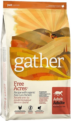 | Gather Free Acres Organic Free-Run Chicken Recipe for Adult Cats | Dry | Chicken | 3664 kcal/kg | $6.88 per lb | B+ |
