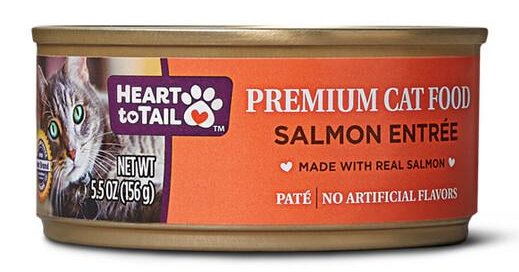 Heart to Tail Premium Cat Food Salmon Entree (Made With Real Salmon) could be a budget-friendly fallback food. However, it contains some concerning ingredients.
