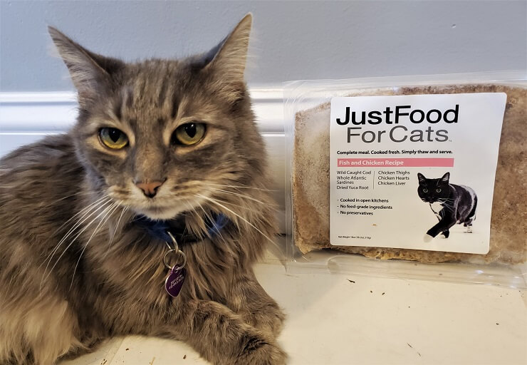 Just Food for Cats offers a single fresh frozen cat food recipe made with fish and chicken. Here’s what they have to say about it on their website:
