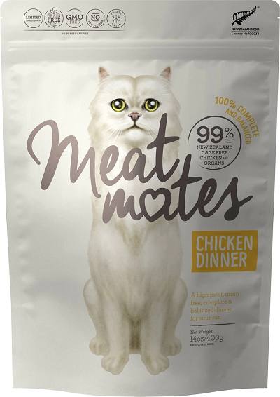 | Meat Mates Chicken Dinner Grain-Free Freeze-Dried Cat Food | Freeze-Dried | Chicken | 164 kcal/cup | $3.10 per oz | A |
