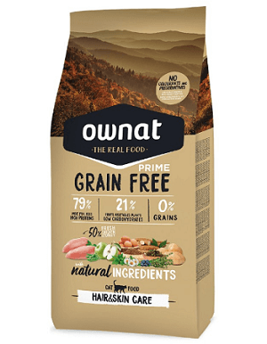 - Ownat Grain-Free dry cat food is free of cereals, rich in proteins, and low in carbohydrates. They come in several formulas. Ownat Just Grain-Free is available in adult chicken and sterilized. Ownat Grain-Free Prime (50 percent fresh meat) is available in adult chicken & turkey; sterilized; sterilized fish; hair & skin formula; and kitten.