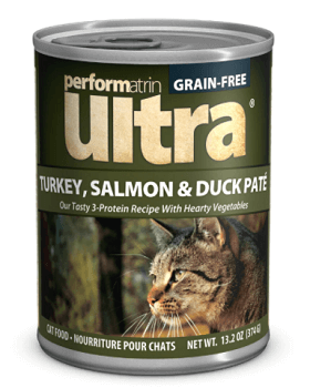| Performatrin Ultra Grain-Free Turkey, Salmon & Duck Pate Canned Food | Wet | Turkey | 122 kcal/can (3oz.) | $0.31 per oz | B |