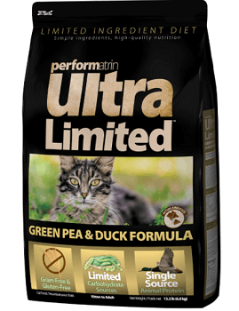 | Performatrin Ultra Limited Green Pea & Duck Formula Dry Cat Food | Dry | Duck | 422 kcal/cup | $0.25 per oz | D |