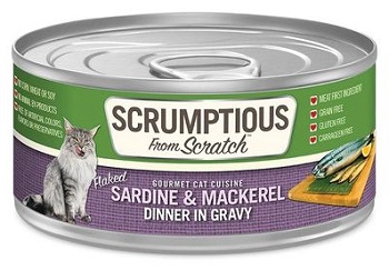 | Scrumptious From Scratch Sardine And Mackerel – Dinner In Gravy | Wet | Sardine, Mackerel | 94 kcal per 100g | $0.68 per oz | A- |