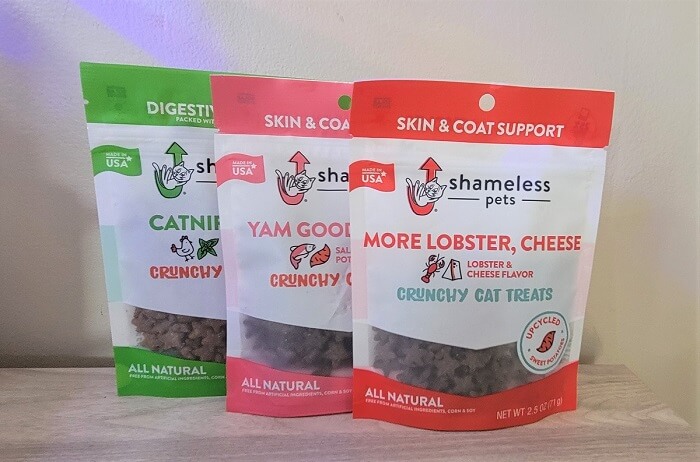 Shameless currently offers three different recipes for crunchy cat treats. Each recipe starts with an animal-based protein as the first ingredient and is supplemented with other whole food ingredients to provide supplemental nutrition.