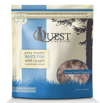 Freeze-dried cat food from the Quest line is very expensive, over $2 per ounce. This puts it on par with other freeze-dried cat food brands like Stella & Chewy’s, though it’s cheaper than Feline Natural. The daily cost to feed a 10-pound cat the whitefish recipe reviewed above is about $3.93.