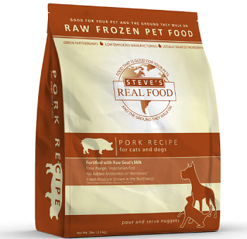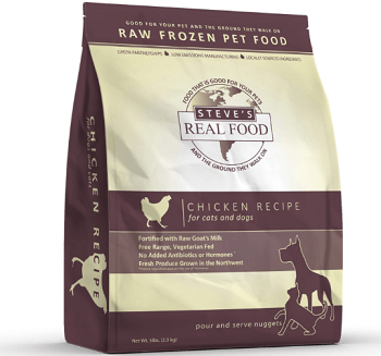 Steve’s Real Food offers five raw frozen foods that are formulated to provide complete and balanced nutrition for both cats and dogs. These recipes contain whole meats, organ, and bones but also incorporate nutrient-rich foods like raw goat’s milk, eggshell membrane, and kelp.